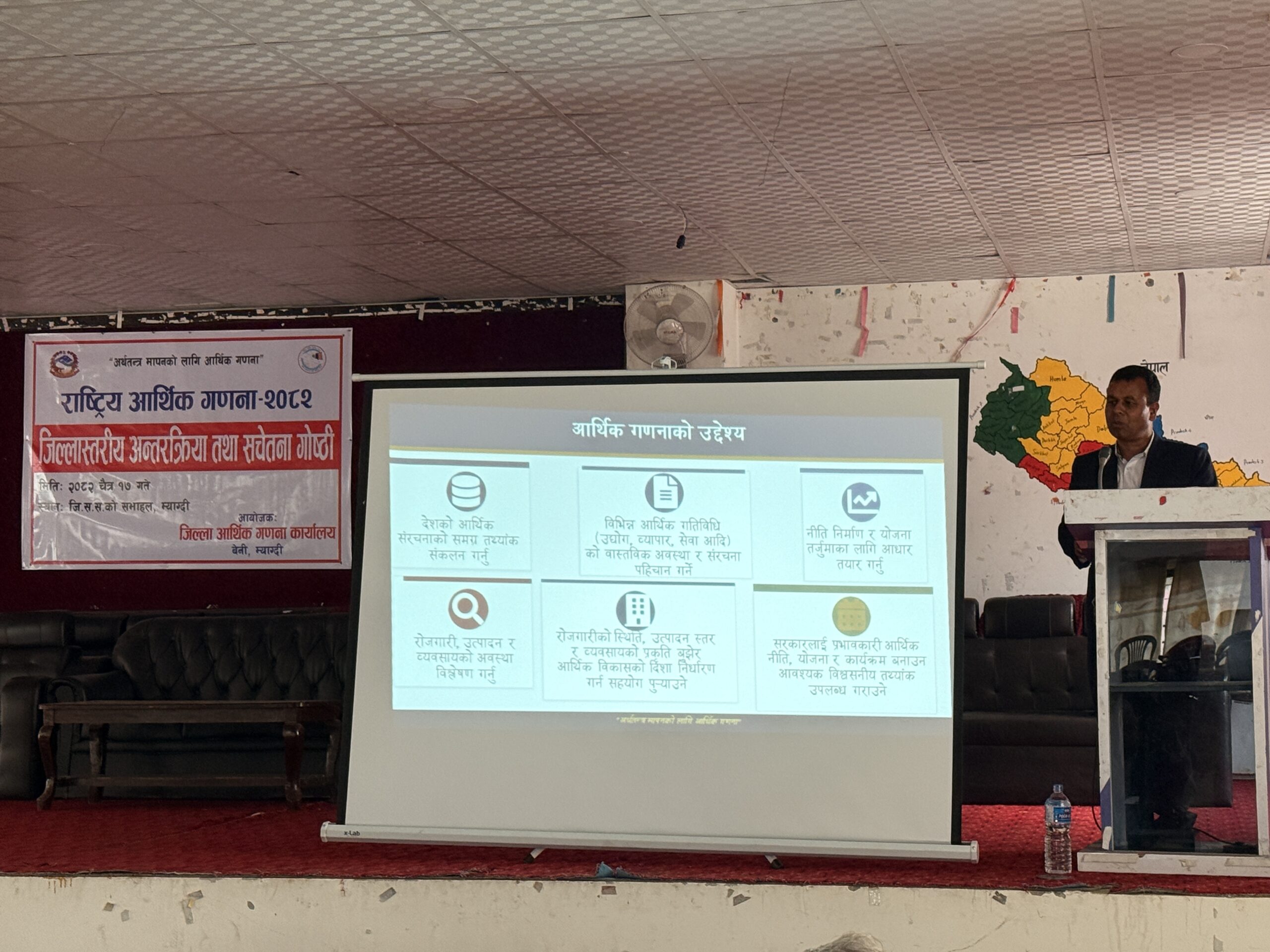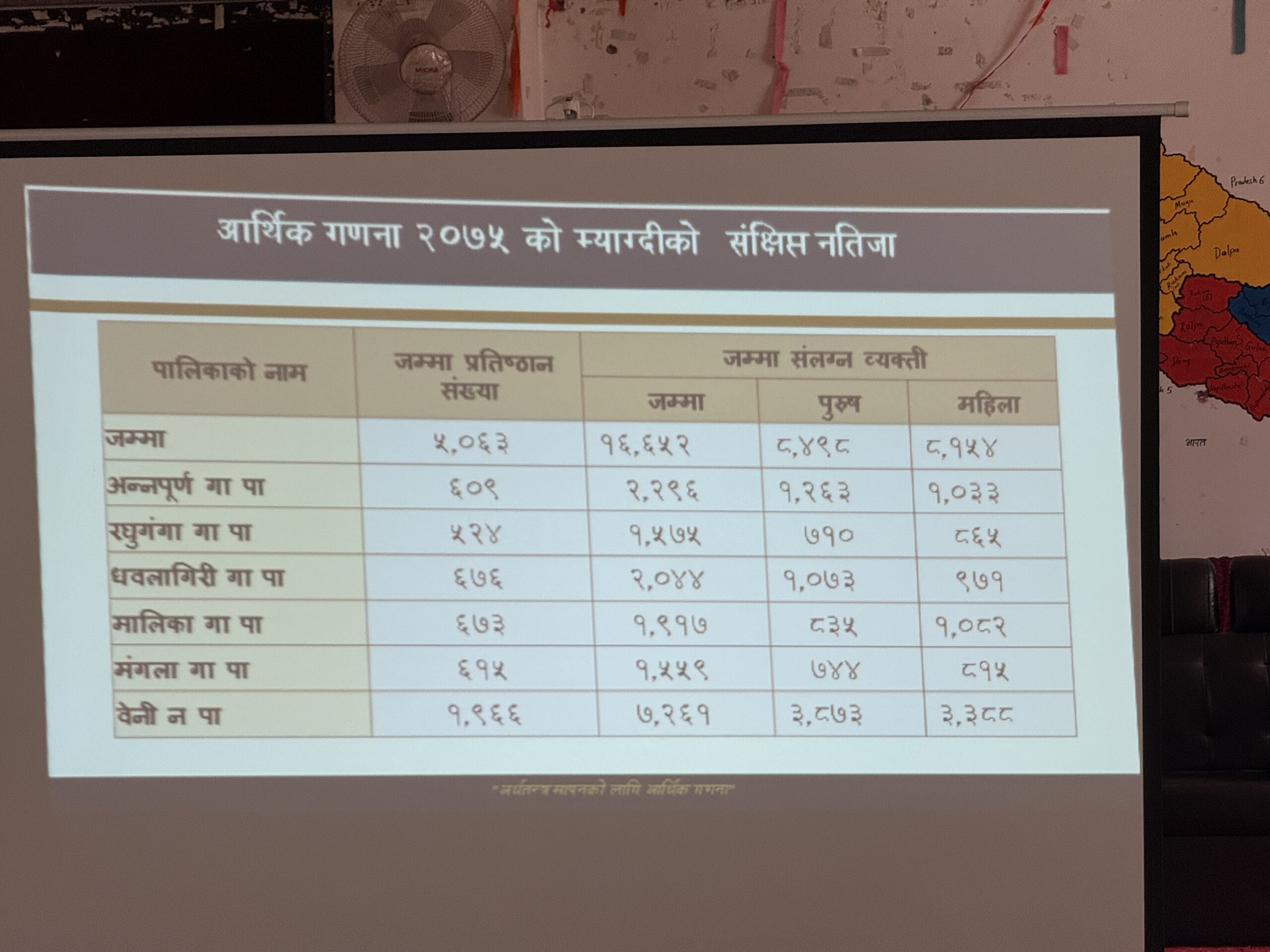 म्याग्दीका प्रमुख जिल्ला अधिकारी रविन्द्र आचार्यको अध्यक्षता, आर्थिक गणना अधिकारी सापकोटाको स्वागत तथा बागलुङका अधिकारी सुबेदीको प्रस्तुतीकरणमा सम्पन्न भएको थियो । २०७५ सालमा लिइएको तथ्यांकमा म्याग्दीमा ५ हजार ६३ दर्ता भएका फर्म तथा प्रतिष्ठानमा १६ हजार ६ सय ५२ जना संलग्न रहेको गणना गरिएको थियो । आर्थिक गणनाले व्यवसाय, कृषि उत्पादन, आय तथा व्यय र आंशिक तथा दिर्घकालिन रोजगारीका बारेमा हालको अवस्थालाई तथ्यांकले देखाउने छ ।