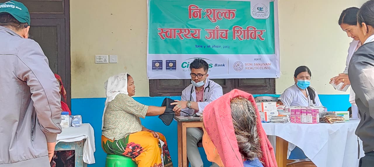 म्याग्दीको सदरमुकाम बेनी न्यूरोडमा अवस्थित सिटिजन्स बैंक इन्टरनेसनल लिमिटेड बेनी शाखाले १९ औं वार्षिकोत्सको अवसरमा मंगला गाउँपालिका–२ कोत्रबाङमा निःशुल्क स्वास्थ्य शिविर सञ्चालन गरेको छ ।