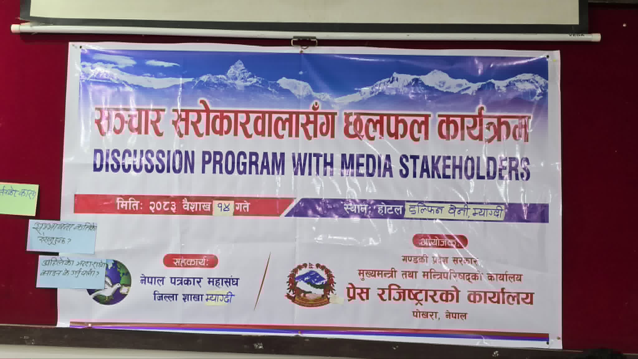 प्रेस रजिष्ट्रारको कार्यालय गण्डकी प्रदेश पोखराको आयोजनामा सोमबार म्याग्दीको सदरमुकाम बेनीमा सञ्चार सरोकारवालासँग छलफल कार्यक्रम सम्पन्न भएको छ । प्रेस रजिष्ट्रारको कार्यालय पोखराद्वारा नेपाल पत्रकार महासंघ जिल्ला शाखा म्याग्दीको सहकार्यमा कार्यक्रम गरिएको हो ।