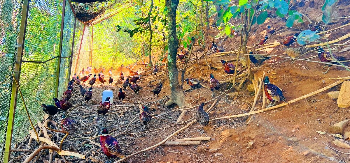 घर नजिकैको जंगलमा फलामे तार बेरेर बनाएको कालिज फार्म। त्यही फार्ममा रातो, हरियो, नीलो र…..