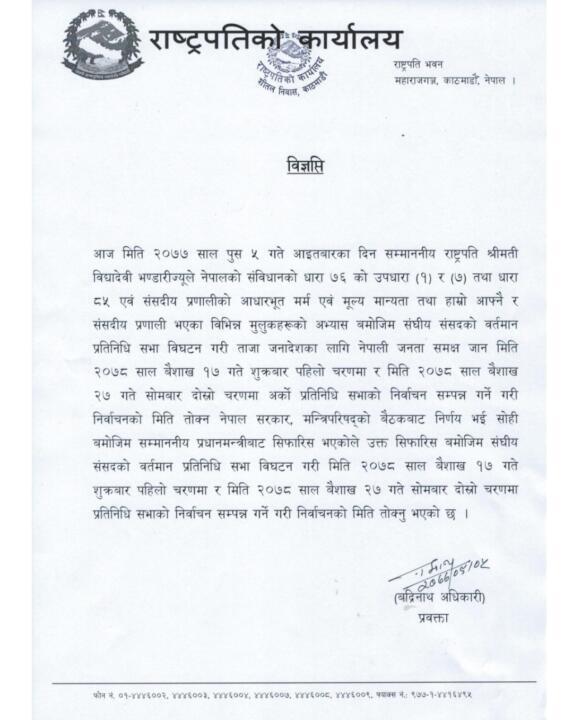 प्रतिनिधिसभा भंग, वैशाख १७ र २७ गते आमनिर्वाचनको घोषणा