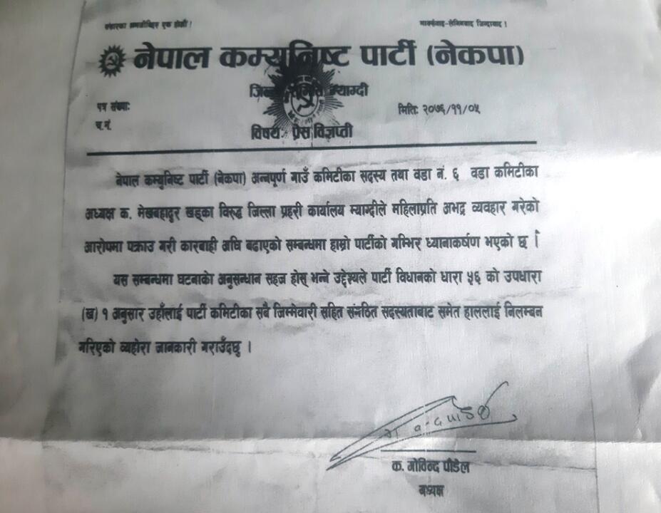 महिलालाई अश्लिल प्रस्ताव राख्ने नेकपाका घार कमिटी अध्यक्ष खड्का निलम्बित